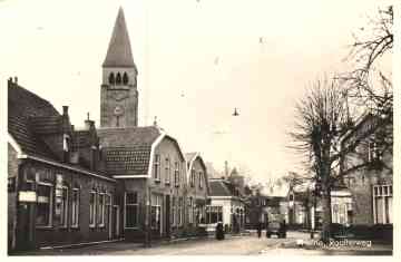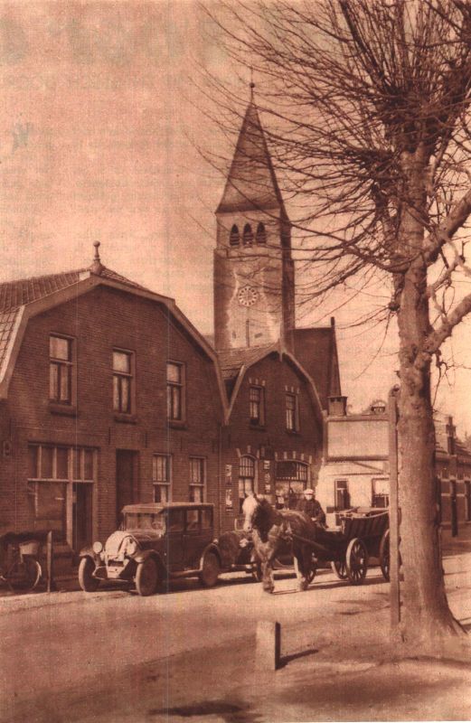 Bijna niet zichtbaar, met de toren van de Nicolaaskerk die er vaag in de verte bovenuit steekt, is het postkantoor waar Overbosch de kantoorhouder was. De paal links is voor de telefoonlijnen die toen nog bovengronds waren.