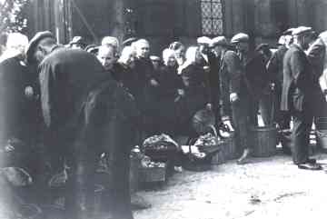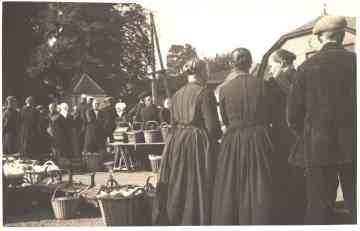 Wekelijks eiermarkt in 1938. In het midden een kringetje vrouwen met knipmutsen