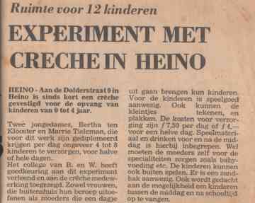 In Heino werd het eerste initiatief voor een crèche genomen door Bertha ten Klooster en Marry Zieleman (in bijgaand persbericht 'Tieleman' genoemd). Zij begonnen al in 1973 aan de Dolderstraat 9 de eerste officiële crèche waar 12 kinderen terechtkonden.