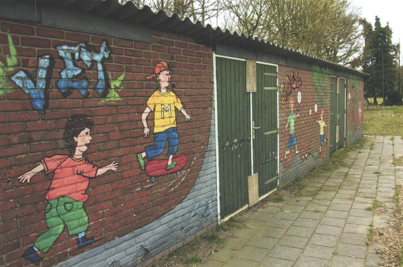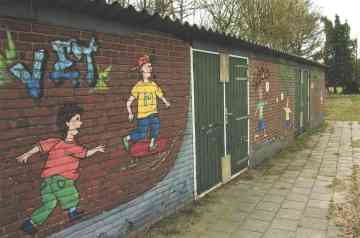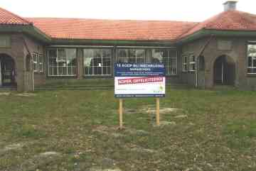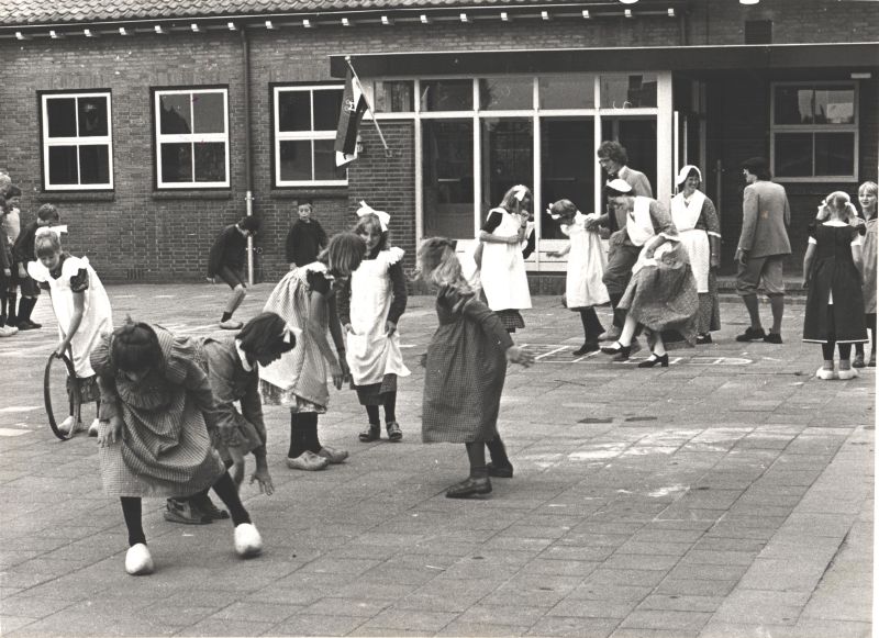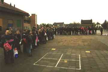 De achterkant van de Mariaschool. De kinderen staan klaar voor de verhuizing naa