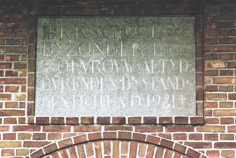 Op de steen staat: RK SCHOOL voor BYZONDER LO OLVROUW ALTYD DVRENDEN BYSTAND GES