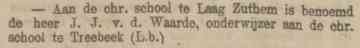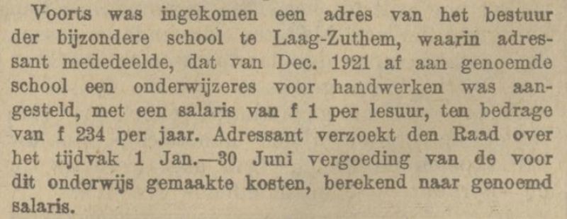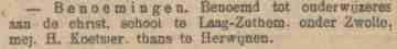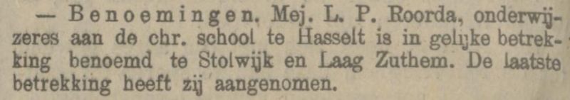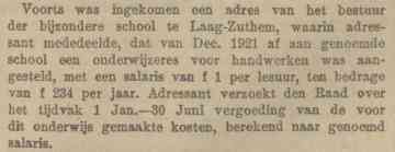 Een maand later, rond 20 oktober, werd ook een onderwijzeres aangesteld, mejuffrouw L.P. Roorda. Opvallend was wel dat op in oktober 1920 een nieuwe onderwijzer J.J. van der Waarde werd aangenomen en in december 1921 alweer een nieuwe onderwijzeres mejuffrouw H. Koetsier. Mogelijk was die laatste de vakonderwijzeres voor handwerken. Haar salaris was 1 gulden per lesuur, op jaarbasis 234 gulden. De kosten werden vergoed door de gemeente Zwollerkerspel.