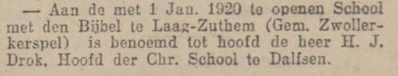 Op 22 september 1919 werd de heer H.J. Drok uit Dalfsen uit 59 sollicitanten geselecteerd als hoofd der school. Een van zijn eerste taken was het schrijven van een ontwerp-leerplan.