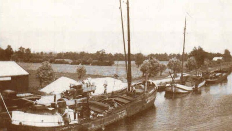Op de andere foto het lossen van het schip van Abele Stavorinus en Dieke Roessink, in het Overijssels Kanaal bij de Ganzepan.
