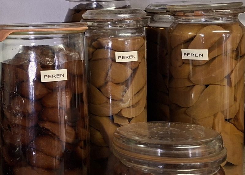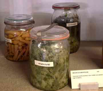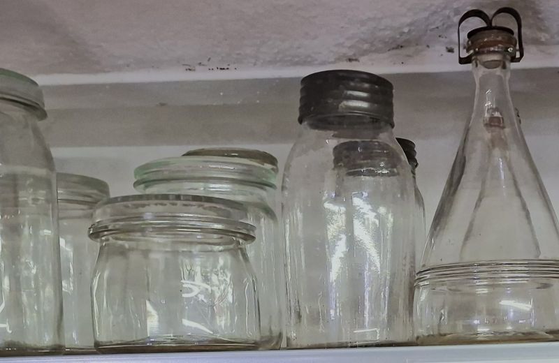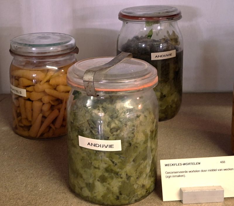 In de kelder van Omheining staan diverse attributen die werden gebruikt tijdens het wecken. Ook is er nog een groot aantal weckflessen met inhoud: groente, fruit, zelfs vlees. Als je die nu open zou maken, kun je het vermoedelijk nog steeds eten. Maar of het lekker is...?
