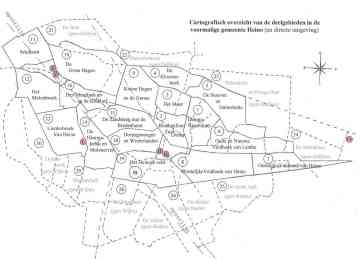 In het verleden werd Oud Heino opgedeeld in deelgebieden, die ook wijken werden genoemd: het Moer, de Veldhoek, Sekdoorn enz. Die zie je op de kaart hiernaast.